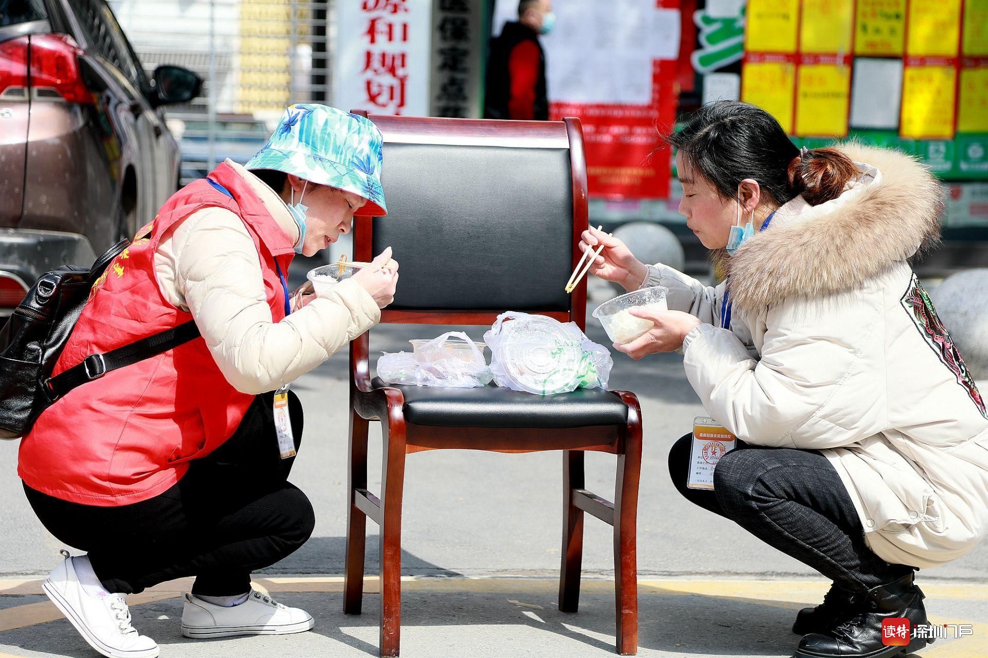 3月7日,監(jiān)利,在街頭執(zhí)勤卡點(diǎn)吃飯的社區(qū)工作人員。