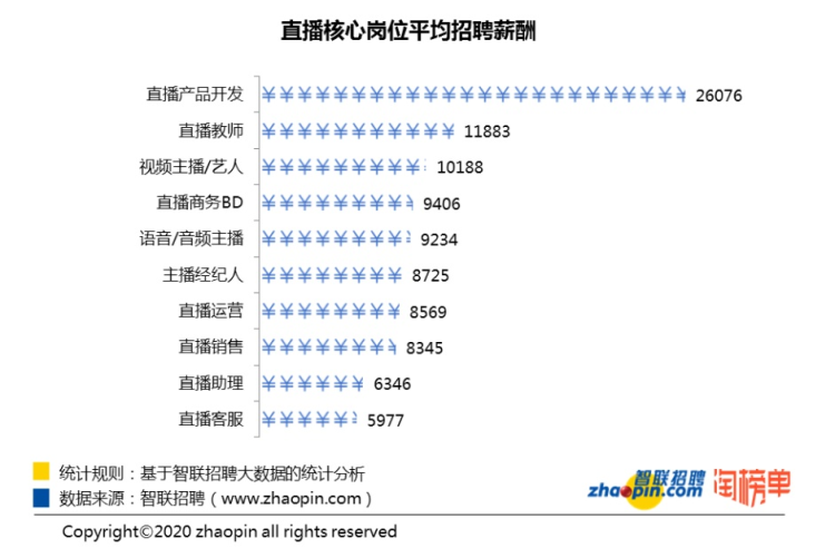 知識、技術密集型和資源密集型的崗位往往工資更高,這對于直播人才也同樣適用。細分來看,負責直播界面設計、開發(fā)、測試、運維等多階段把控的直播產品開發(fā)崗位以26076元/月的高薪位居薪酬第一。此外,直播教師的平均薪資達到11883元/月;直播招聘“顏值”需求最高的,視頻主播/藝人的平均薪資為10188元/月。而同樣作為直播主角的語音主播,由于門檻更低,平均薪資是視頻主播的9成。