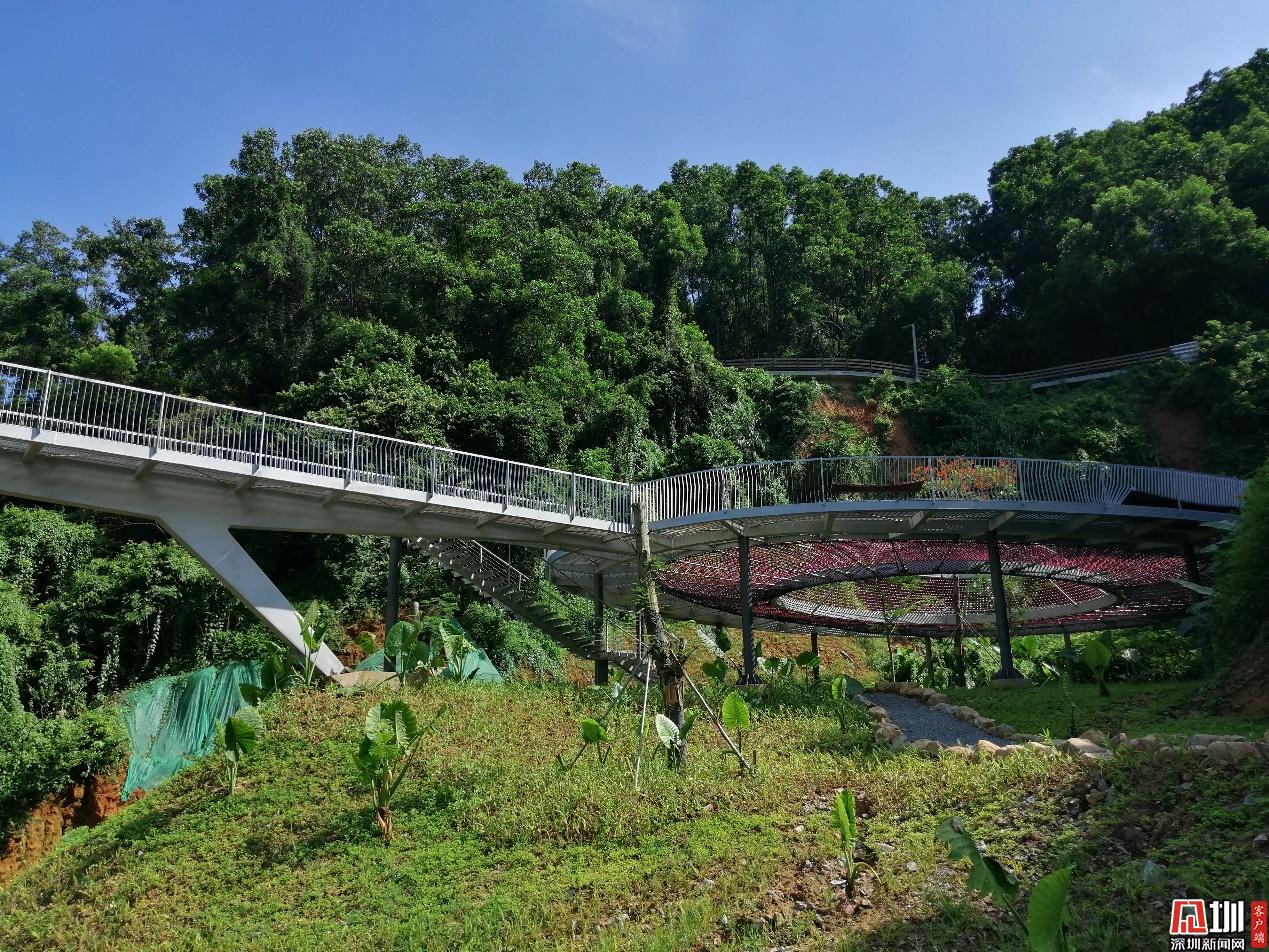 探橋的設(shè)計主題是生態(tài),強調(diào)人和水的親近。利用山體地形高差,修建環(huán)形棧道,通達(dá)低洼處的水潭,形成了與眾不同的親水體驗,同時,中間網(wǎng)紅爬網(wǎng)與橋體相連,打造具有探索趣味的休憩空間。
