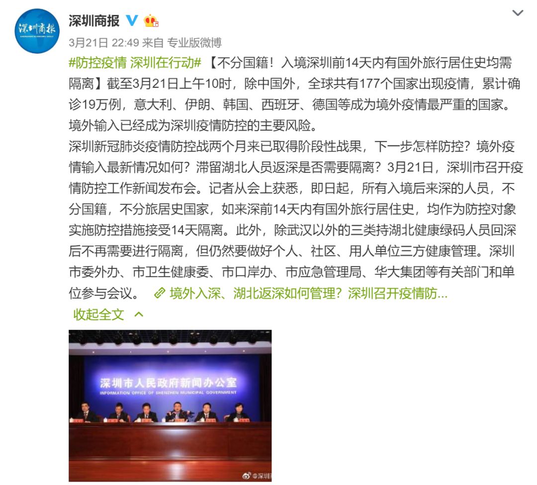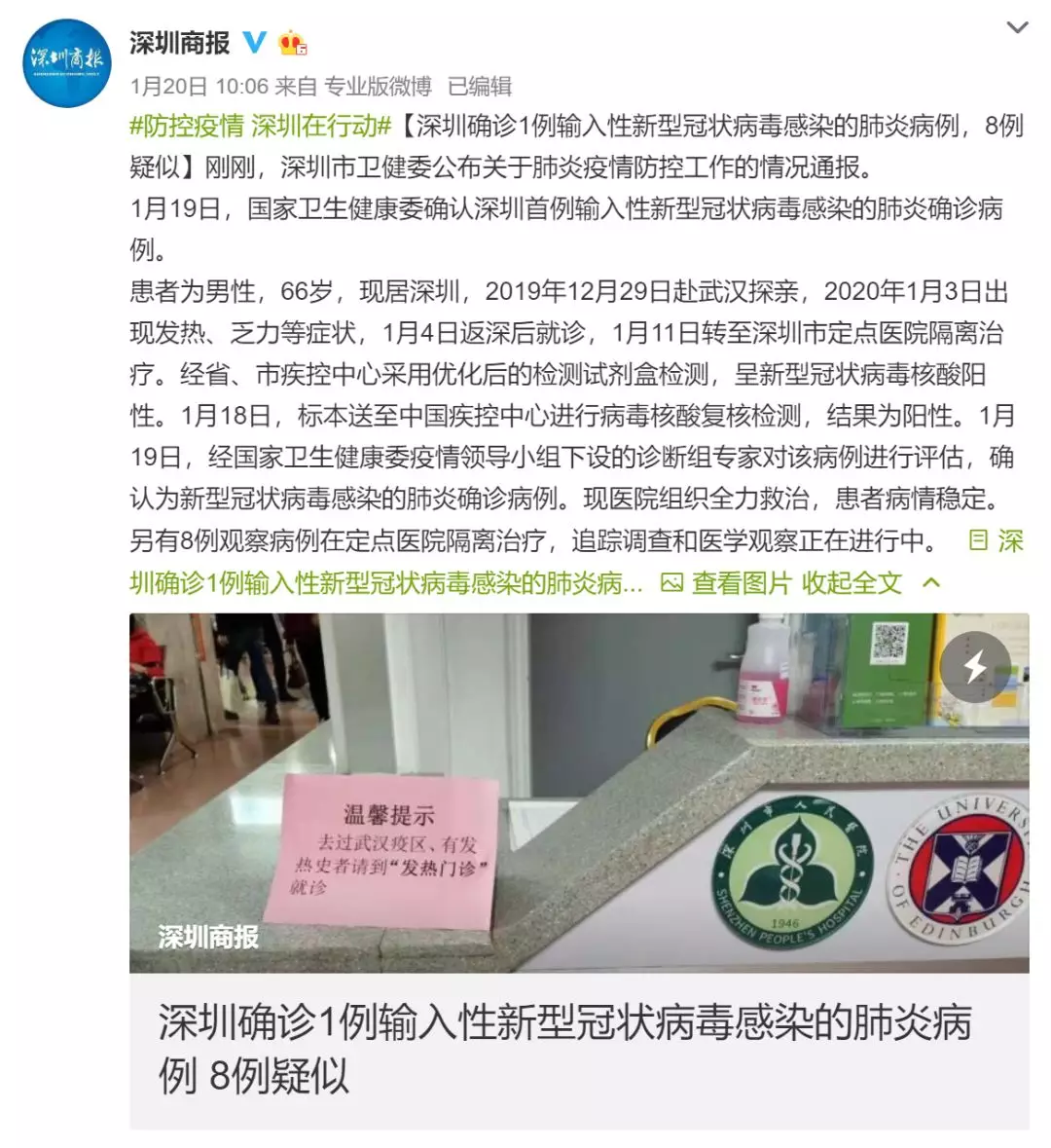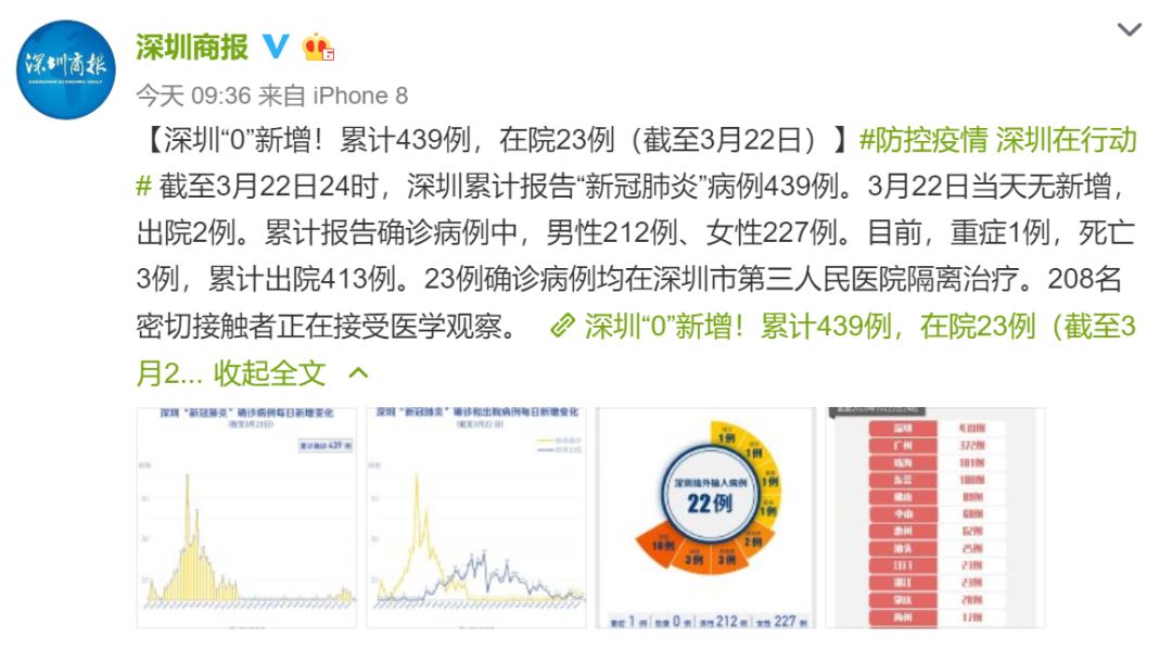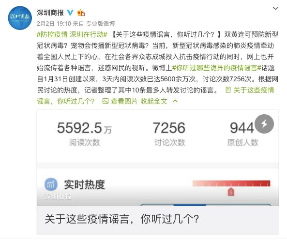 疫情發(fā)生初期,深圳商報(bào)微博創(chuàng)建話題 #防控疫情 深圳在行動(dòng)# ,以高度的責(zé)任感和使命感全方位加強(qiáng)宣傳報(bào)道和輿論引導(dǎo),疫情相關(guān)信息均帶話題發(fā)布,人們可以系統(tǒng)地查看疫情相關(guān)信息。