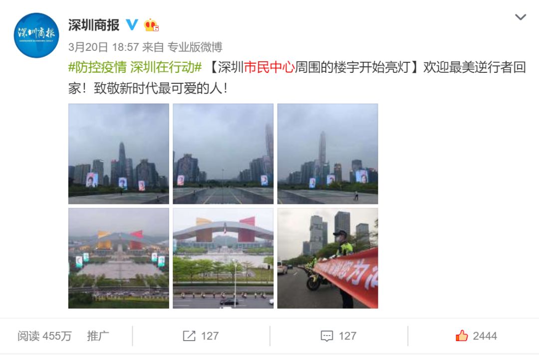 單條微博【深圳市民中心周圍的樓宇開始亮燈】閱讀數(shù)455萬(wàn)+,引起了廣泛關(guān)注。