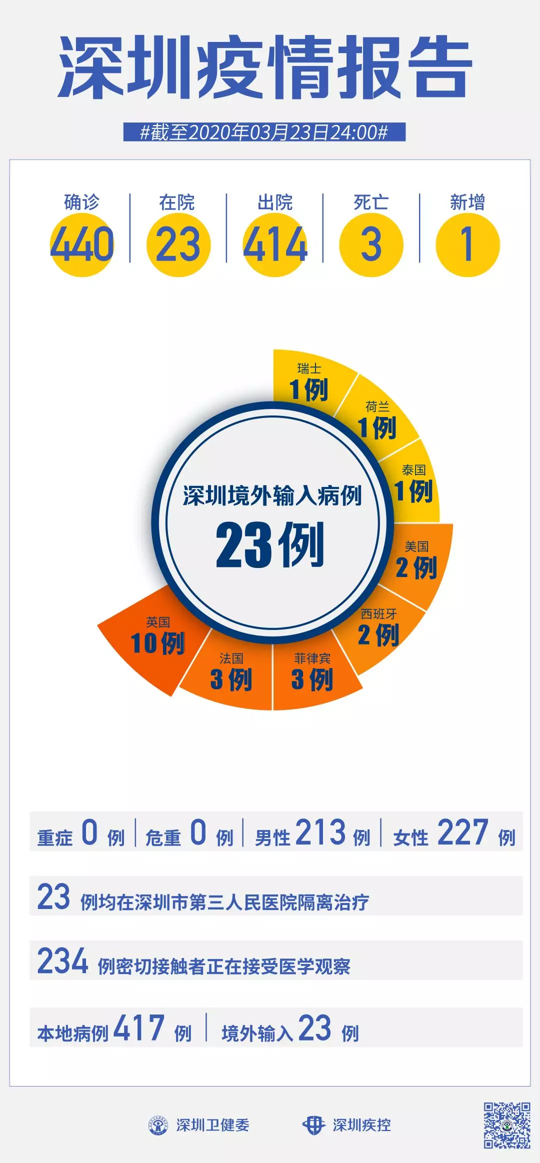 截至3月23日24時(shí),深圳累計(jì)報(bào)告“新冠肺炎”病例440例。3月23日當(dāng)天新增1例,出院1例。