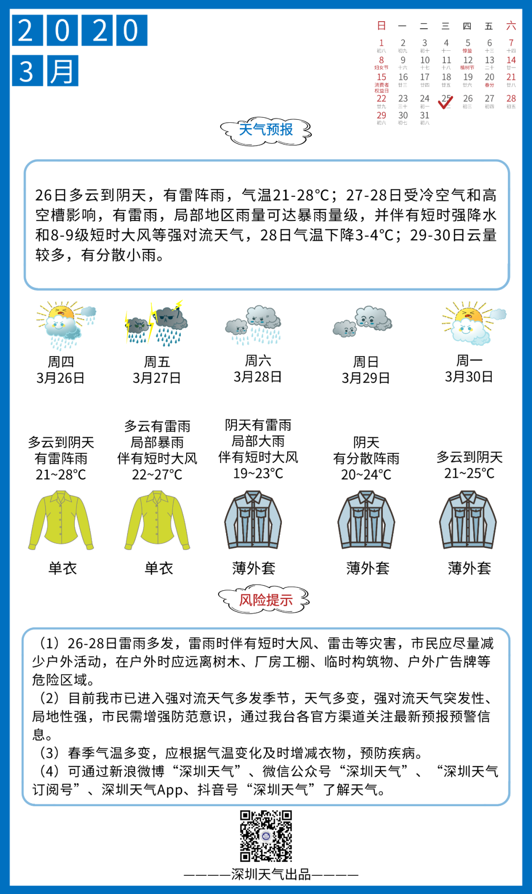 26-28日,深圳雷雨頻繁;26日天氣漸趨不穩(wěn)定,有雷陣雨;27-28日受高空槽、切變線南壓影響,雷雨頻密,局部地區(qū)可達暴雨,伴短時強降水、8-9級短時大風和強雷暴等強對流天氣;28日降水趨于減弱。