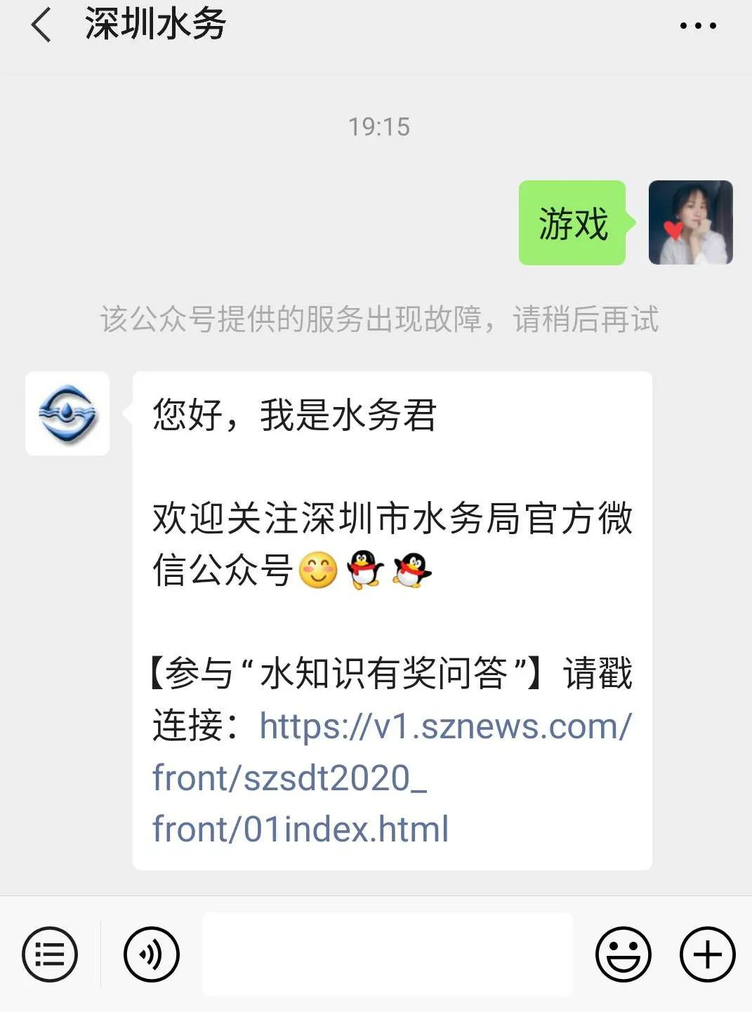 如果您已經(jīng)關(guān)注了“深圳水務(wù)”,可以在公眾號留言欄輸入“游戲”、“答題”“紅包”等關(guān)鍵詞哦。