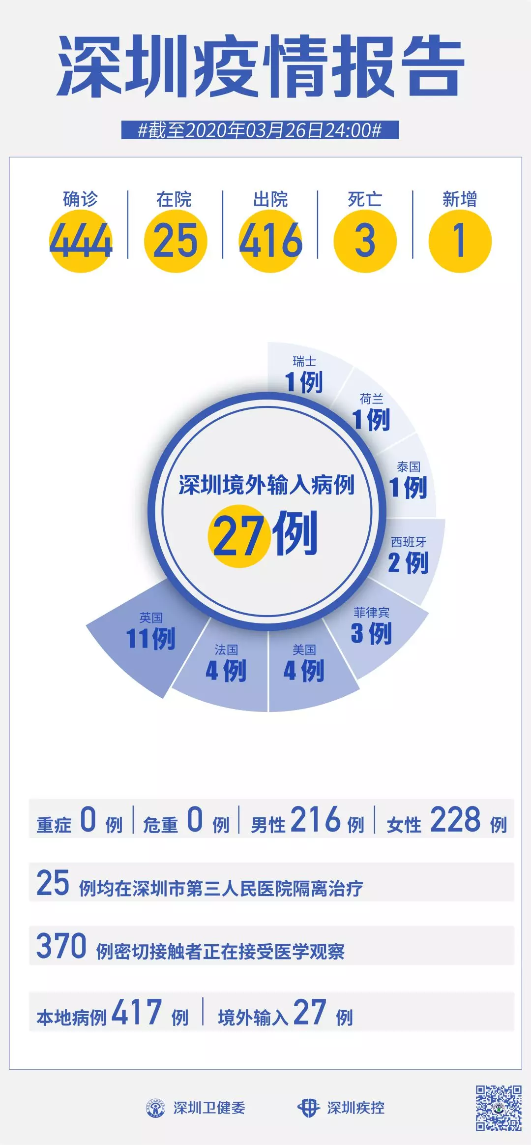 3月26日,深圳確診1例境外輸入“新冠肺炎”新病例,累計(jì)達(dá)27例。 截至3月26日24時(shí),深圳累計(jì)報(bào)告“新冠肺炎”病例444例。3月26日當(dāng)天新增1例,出院1例。 累計(jì)報(bào)告確診病例中,男性216例、女性228例。 目前,死亡3例,累計(jì)出院416例。 25例確診病例均在深圳市第三人民醫(yī)院隔離治療。 370名密切接觸者正在接受醫(yī)學(xué)觀察。 來(lái)源:深圳市疾控中心、深圳市衛(wèi)健委、廣東省衛(wèi)健委