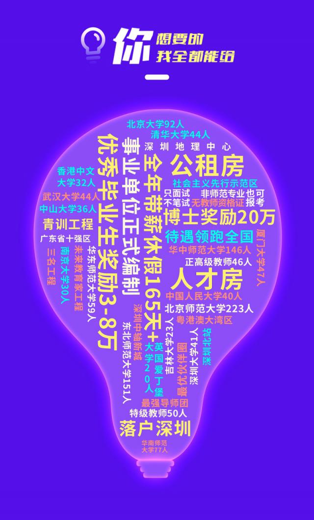 記者了解到,本輪招聘采取只面試、不筆試方式,非師范專業(yè)、無教師資格證者也可報(bào)考。一經(jīng)錄用,應(yīng)聘者可享受事業(yè)單位正式編制、落戶深圳、人才房、公租房、全年帶薪休假165天等待遇。其中,優(yōu)秀畢業(yè)生還將享受3萬 -8萬元獎勵(lì),博士研究生享受20萬元獎勵(lì),待遇領(lǐng)跑全國。