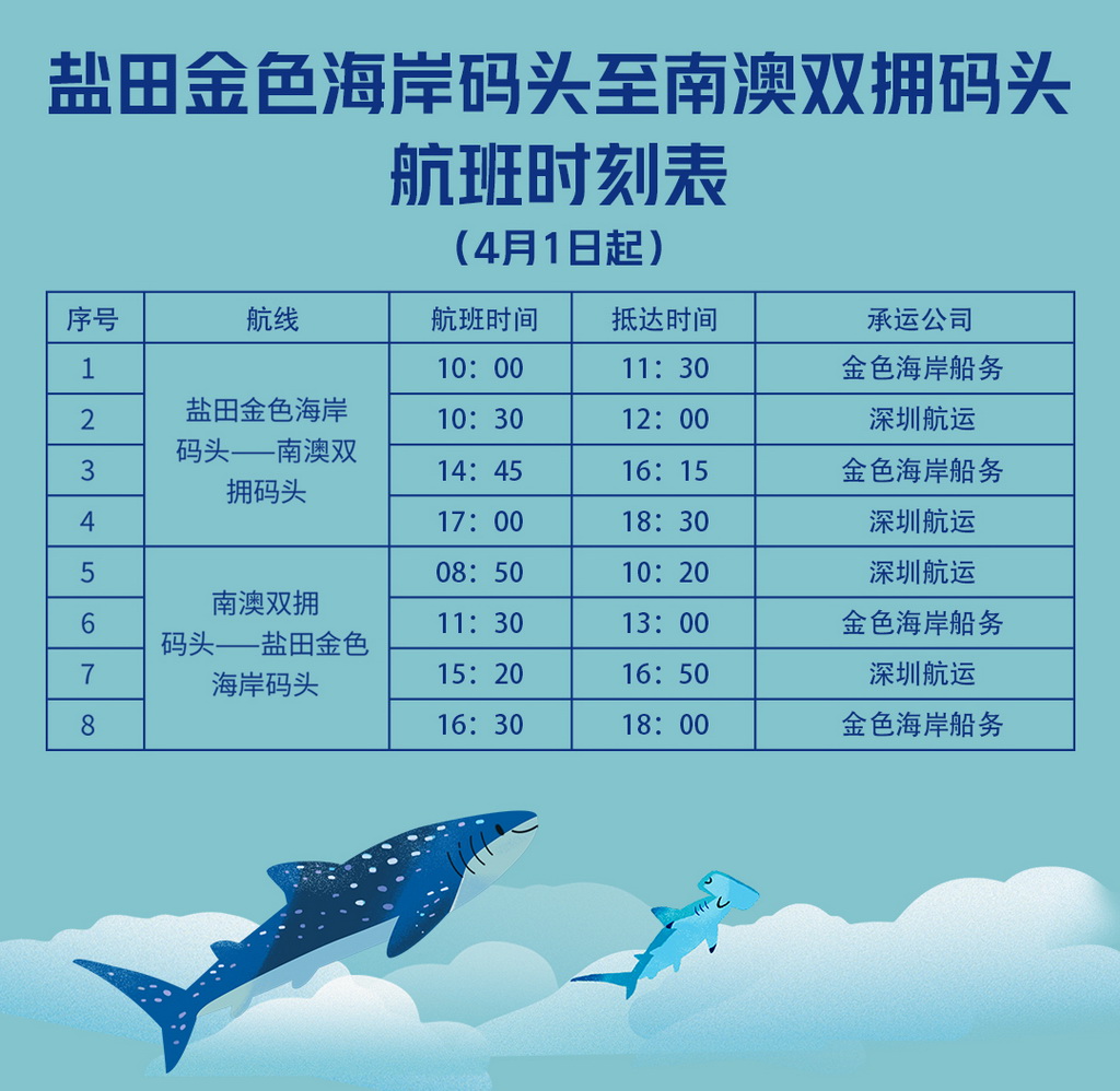 據(jù)了解,“鹽田-南澳”海上交通往返航線自3月12日正式復(fù)航,每天共4班。深圳航運(yùn)集團(tuán)增開后,該航線航班數(shù)量將恢復(fù)至疫情前的水平,達(dá)到每天8班。其中,由鹽田金色海岸碼頭至南澳雙擁碼頭新增航班時(shí)間為:10時(shí)30分和17時(shí);由南澳雙擁碼頭至鹽田金色海岸碼頭新增航班時(shí)間為8時(shí)50分和15時(shí)20分。廣大市民及旅客朋友可通過深圳航運(yùn)旗下公眾號“鵬星會”查詢航班信息及訂票,單程成人票60元/人。