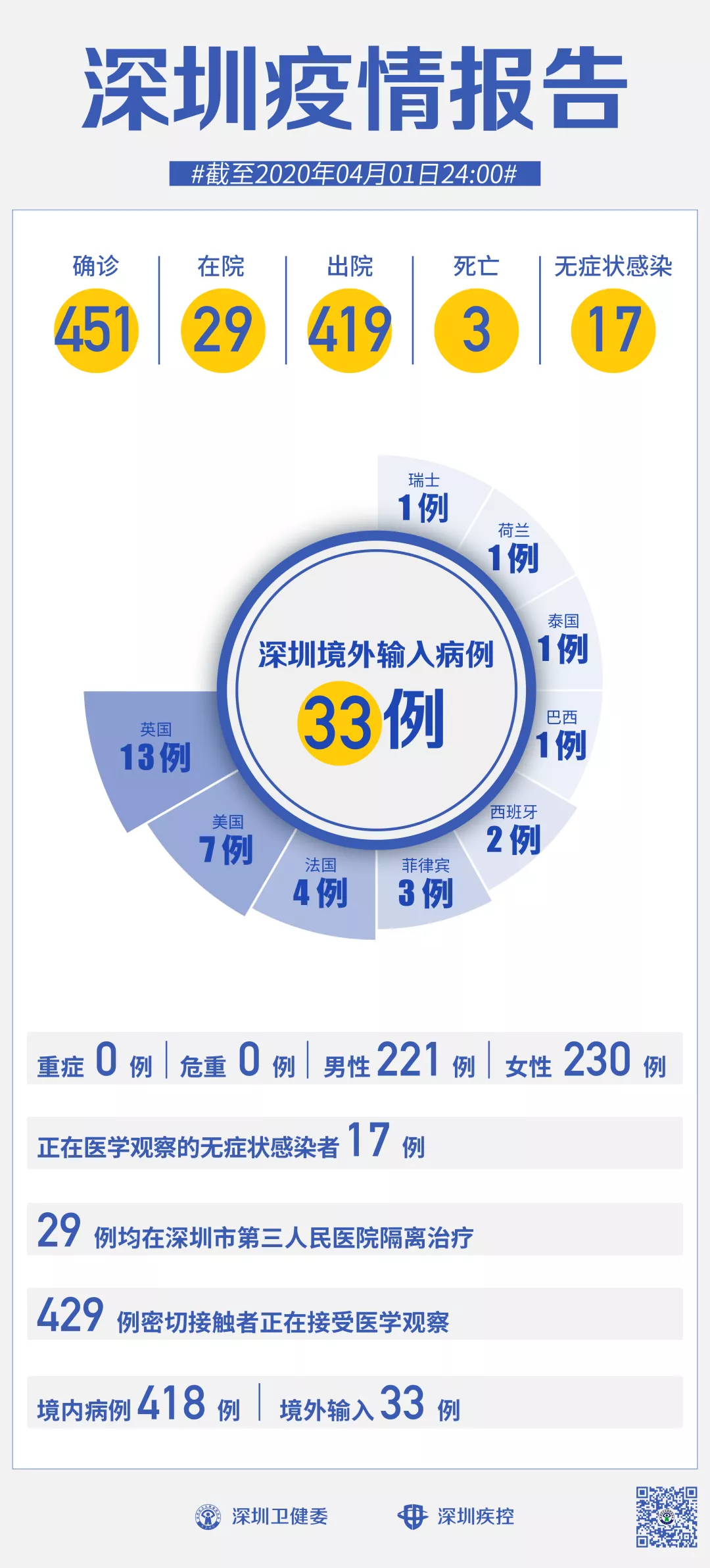 截至4月1日24時,深圳累計報告新冠肺炎病例451例。4月1日當(dāng)天新增無癥狀感染者2例,出院2例。