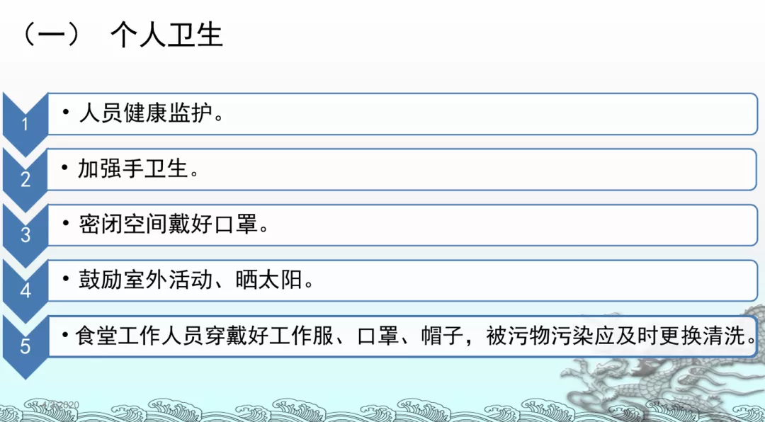 五是做好教育培訓工作。學校要開展多種形式的健康宣教,普及新冠肺炎防控知識,組織師生學習教育部和市教育局下發(fā)的各類指南和防疫知識。