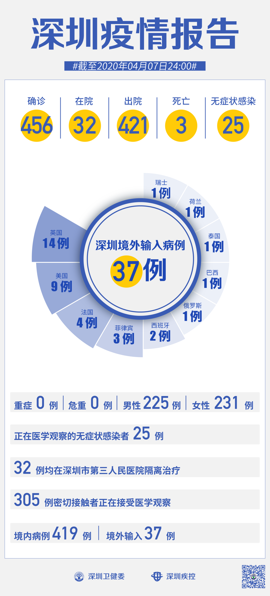 截至4月7日24時(shí),深圳累計(jì)報(bào)告新冠肺炎病例456例。4月7日當(dāng)天新增境外輸入病例1例,新增無癥狀感染者1例,出院1例。