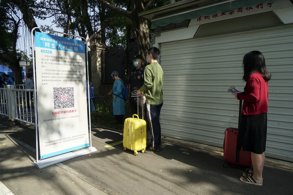 帶行李箱的學生走專用通道,依次完成掃碼核驗、測量體溫等流程后進入校園。
