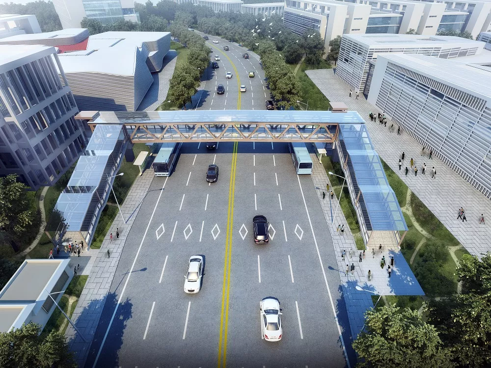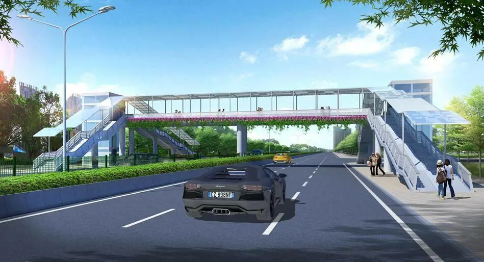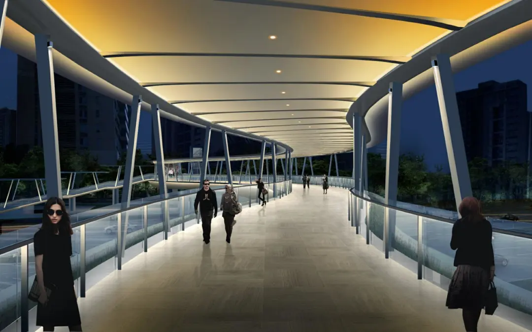 跨越南山區(qū)沙河西路,西接大沖片區(qū),東接沙河西生態(tài)長廊,橋長約113米,橋面凈寬約4.3米,主橋共4跨。天橋設(shè)計(jì)容景觀、造型、燈光、周邊環(huán)境于一體,設(shè)置無障礙觀光電梯,采用鋼箱梁及花崗巖面磚鋪裝、綠化自動滴灌等。天橋的建設(shè)將大大縮短居民繞行時(shí)間,對完善周邊居民出行環(huán)境具有重要意義。