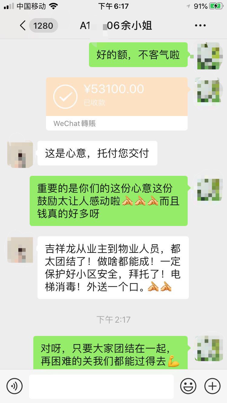 一天下來,吉祥龍小區(qū)共有156位愛心業(yè)主通過線上籌集款項53100元,最后以微信轉(zhuǎn)賬的形式轉(zhuǎn)給了吉祥龍小區(qū)服務(wù)中心負(fù)責(zé)人張經(jīng)理,并委托其轉(zhuǎn)交給堅守在工作崗位的每一位物業(yè)員工手中。
