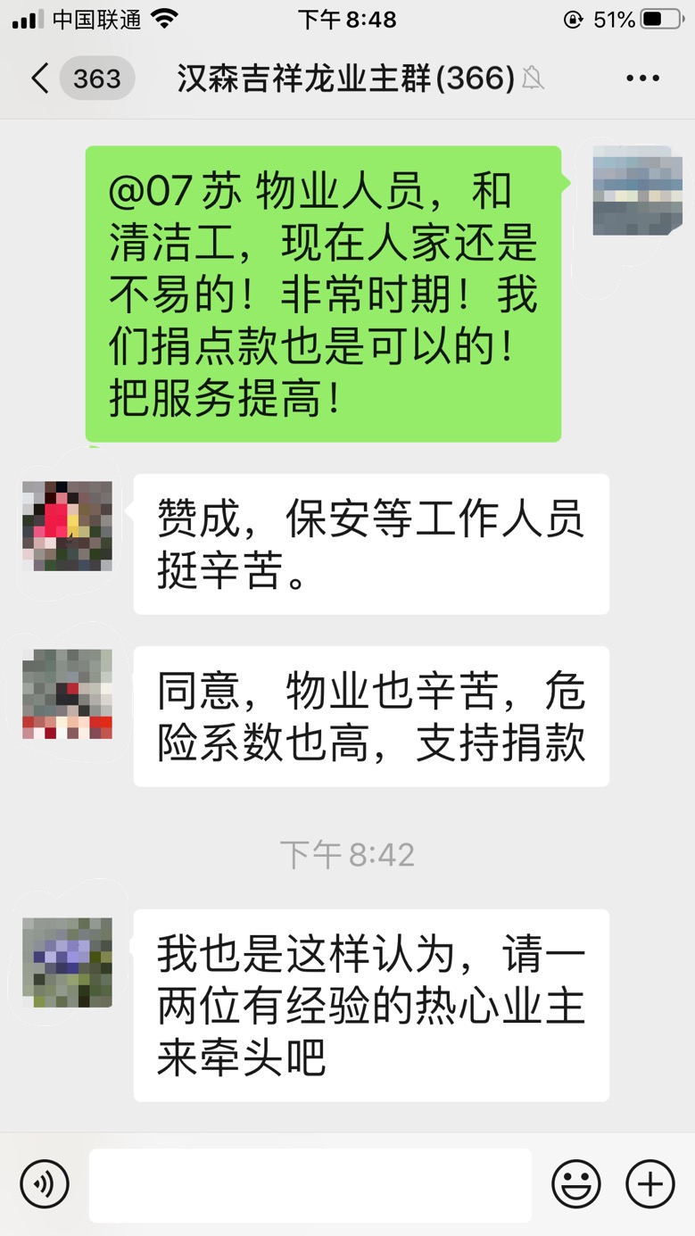 原來,吉祥龍小區(qū)業(yè)主因為覺得物業(yè)一線工作人員抗戰(zhàn)疫情工作危險又更辛苦,便在微信群內(nèi)發(fā)起了給本小區(qū)物業(yè)人員捐款的倡議,收到了眾多業(yè)主的熱烈反響?!百澇?,保安等工作人員挺辛苦”、“同意,物業(yè)也辛苦,危險系數(shù)也高,支持捐款”……業(yè)主們通過討論,約定好捐贈方式全憑自愿、不搞強(qiáng)制、不論數(shù)額、謹(jǐn)表心意。短短一小時,捐贈金額就達(dá)到了3萬余元。業(yè)主余小姐表示,吉祥龍小區(qū)業(yè)主和物業(yè)人員在防疫過程中正團(tuán)結(jié)一心、關(guān)系緊密,一定能保護(hù)好小區(qū)安全。