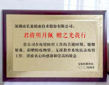 “君將明月佩,贈(zèng)之光我行”,接收物資后,寶安區(qū)教育局為長盈精密公司贈(zèng)送題詞牌匾,以表示對(duì)該公司在防疫關(guān)鍵時(shí)期慷慨解囊,支援教育系統(tǒng)抗擊疫情工作的感謝和敬意。
