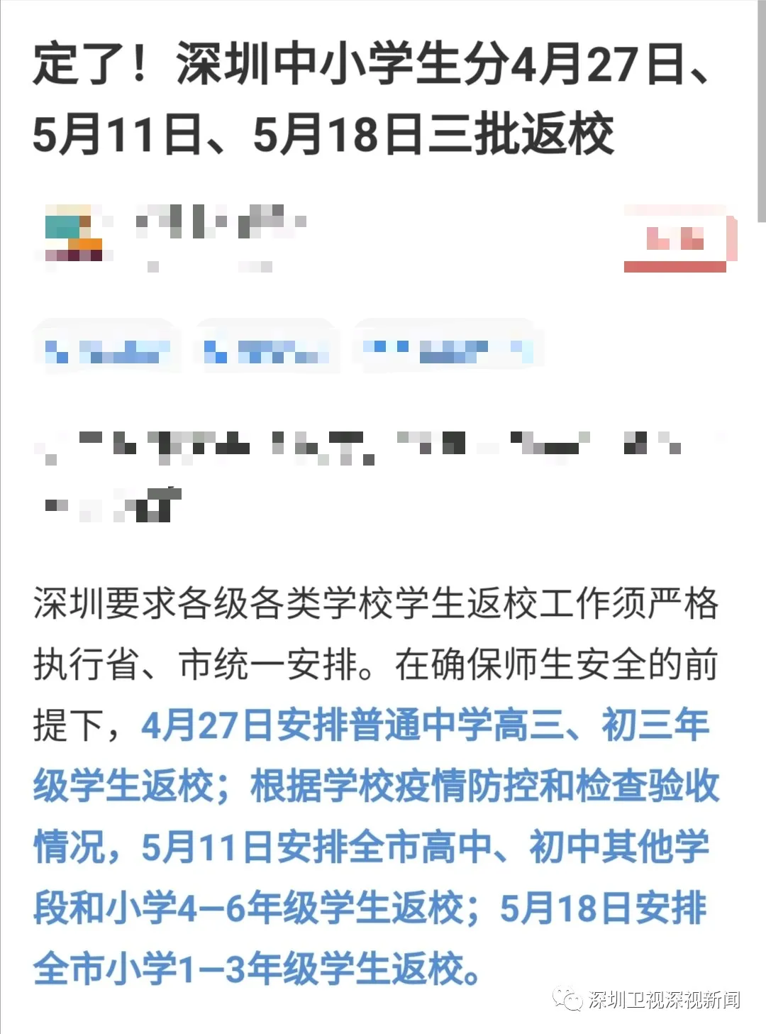 近日,有媒體報(bào)道稱,深圳中小學(xué)生返校時(shí)間已確定。5月11日安排全市高中、初中其他學(xué)段和小學(xué)4—6年級(jí)學(xué)生返校;5月18日安排全市小學(xué)1—3年級(jí)學(xué)生返校。