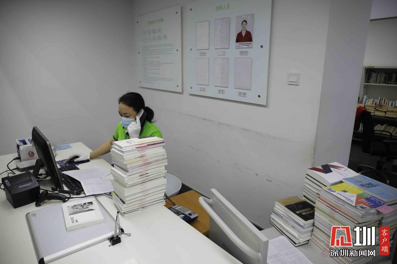圖書(shū)館服務(wù)臺(tái),工作人員正在接聽(tīng)市民電話(huà)。