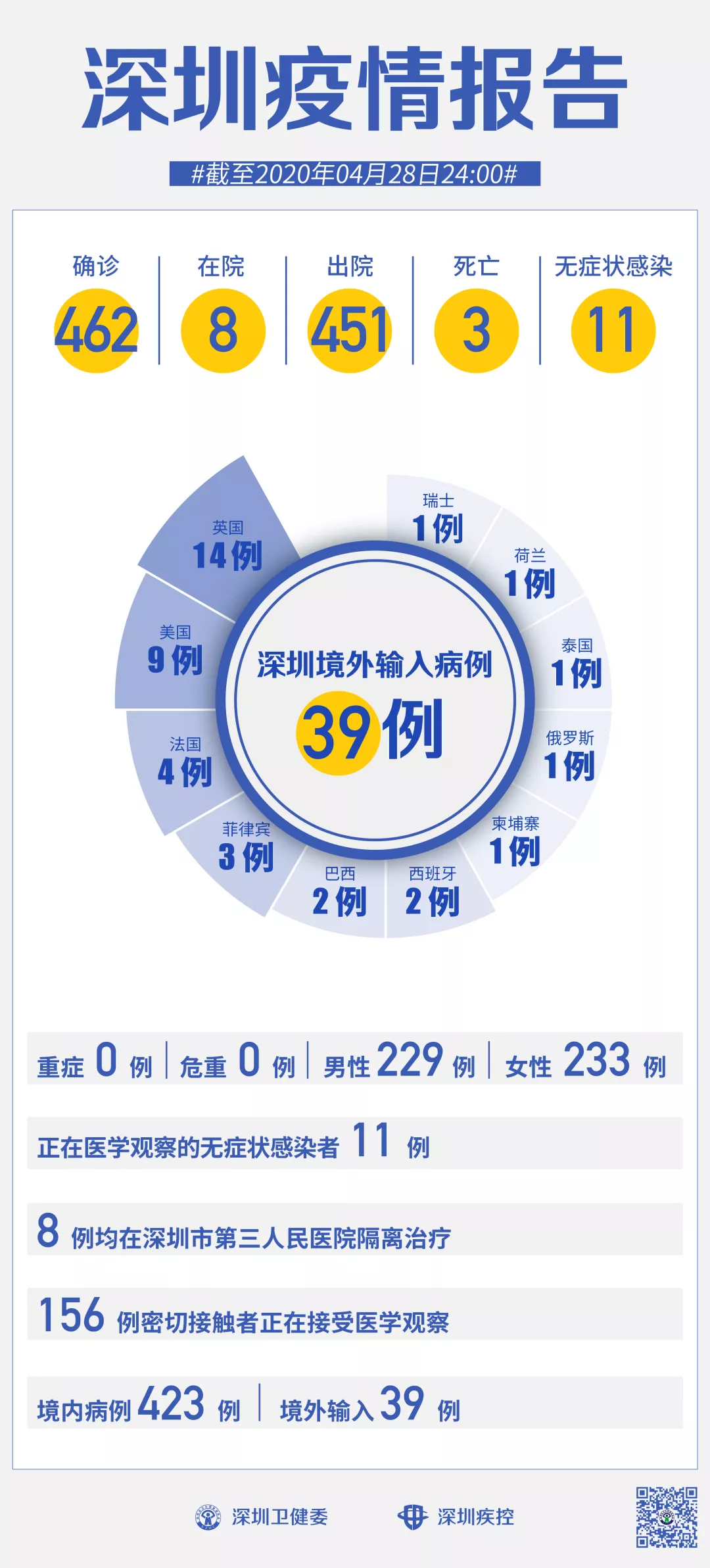 截至4月28日24時,深圳累計報告新冠肺炎病例462例。4月28日當天新增境內(nèi)病例1例,出院4例。