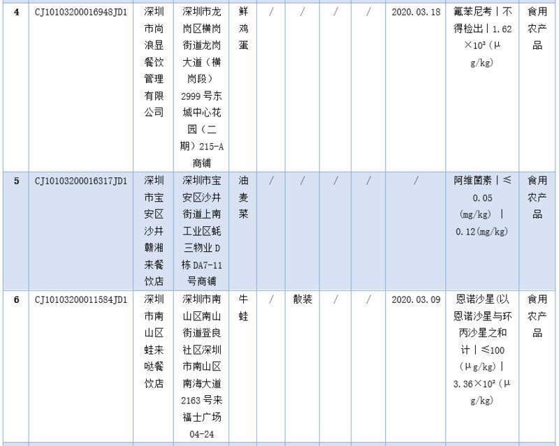 在不合格食品中,記者注意到,深圳市尚浪顯餐飲管理有限公司的鮮雞蛋及深圳市大汗食品有限公司的雞蛋均檢出氟苯尼考。據(jù)悉,氟苯尼考又稱氟甲砜霉素,是農(nóng)業(yè)部批準(zhǔn)使用的動(dòng)物專用抗菌藥,主要用于敏感細(xì)菌所致的豬、雞、魚的細(xì)菌性疾病?!秳?dòng)物性食品中獸藥最高殘留限量》中規(guī)定,氟苯尼考可用于豬、牛、羊、禽、魚等,在產(chǎn)蛋家禽中禁用(雞蛋、鵝蛋中不得檢出)。正常情況下消費(fèi)者不必對雞蛋、鵝蛋中檢出氟苯尼考過于擔(dān)心,但長期食用氟苯尼考?xì)埩舫瑯?biāo)的蛋品,對人體健康有一定風(fēng)險(xiǎn)。