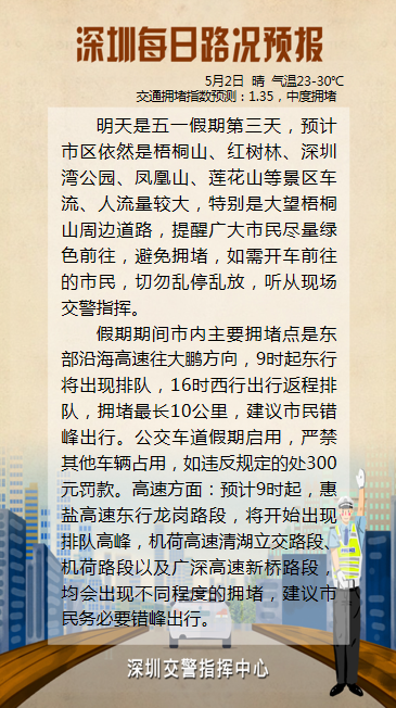 由于市民出行意愿較強(qiáng)烈,預(yù)計(jì)明日市內(nèi)熱門(mén)商圈、景區(qū)、公園的車流量壓力仍較大,大鵬、鹽田等濱海景區(qū)車流量將會(huì)持續(xù)增加。