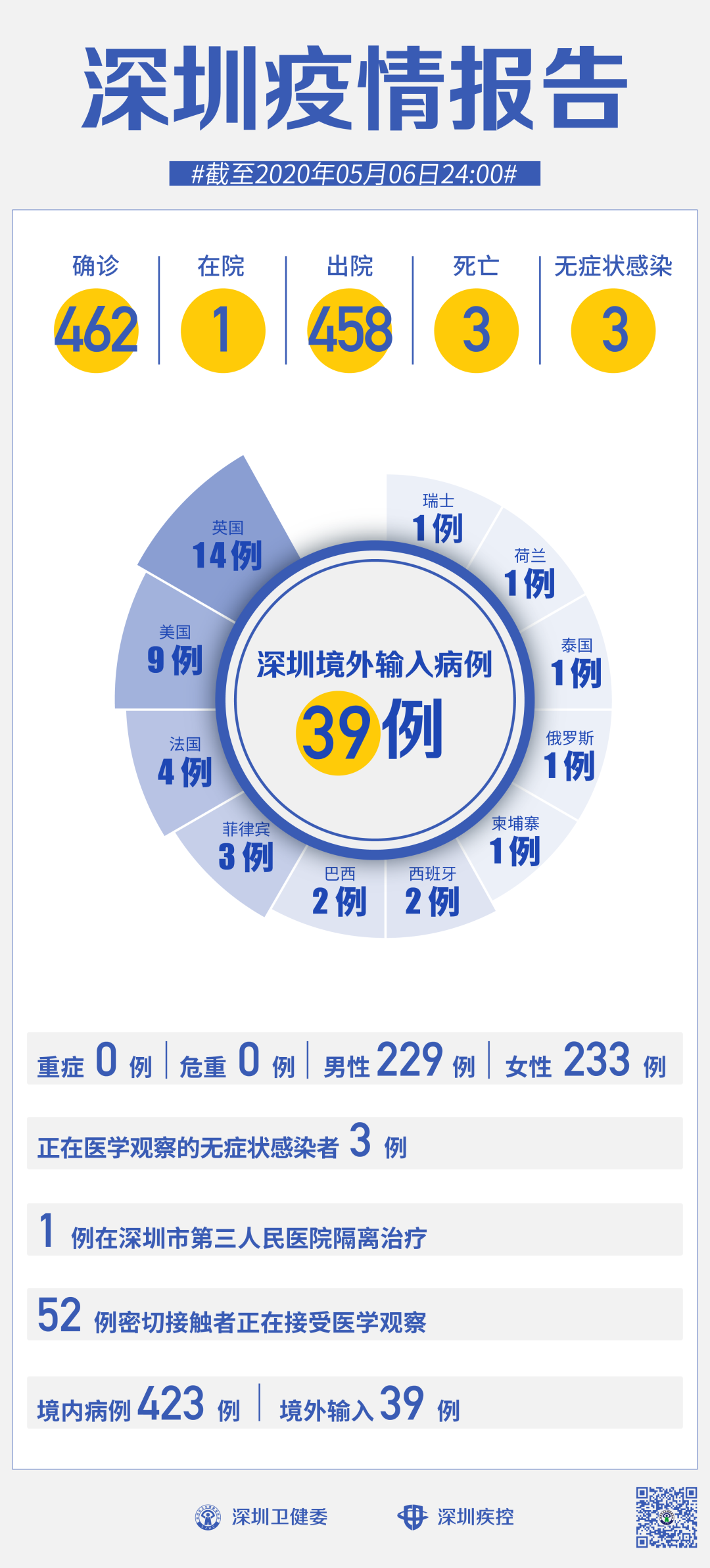截至5月6日24時(shí),深圳累計(jì)報(bào)告新冠肺炎病例462例。在院治療僅有1例。