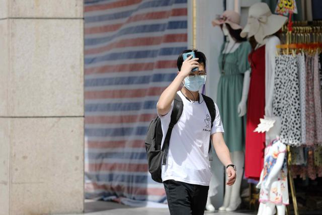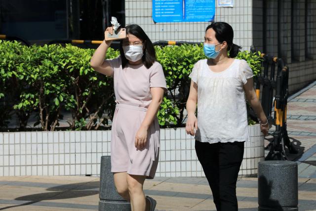 ▲走在街上,熱浪撲面而來(lái),耀眼的陽(yáng)光把人曬得睜不開眼,行人紛紛拿起手頭物品遮擋烈日。