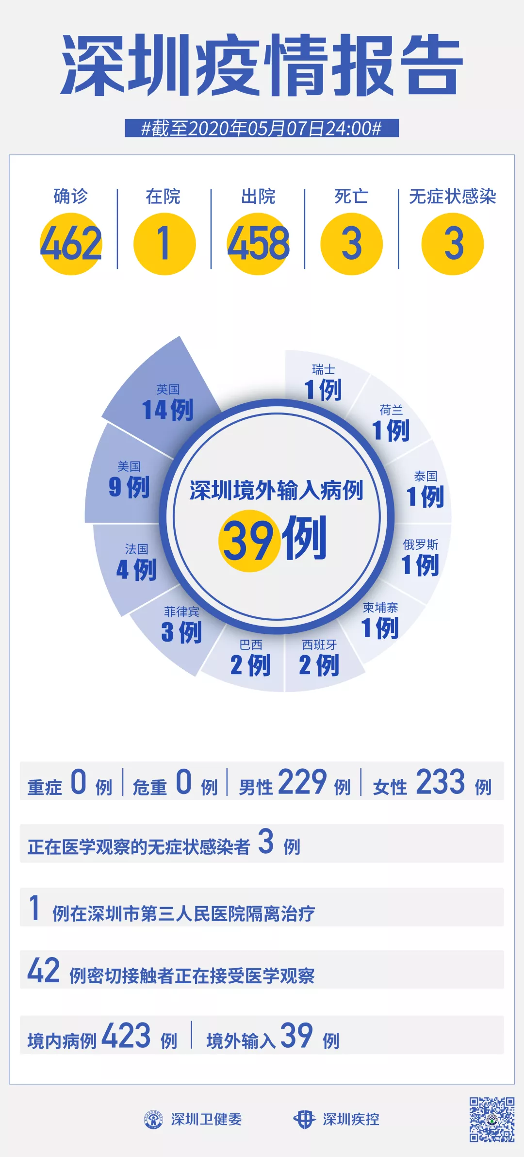 截至5月7日24時(shí),深圳累計(jì)報(bào)告新冠肺炎病例462例。在院治療僅有1例。