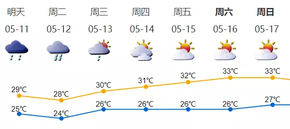 5月11日陰天,氣溫25-29℃,有陣雨或雷陣雨,伴有短時陣風(fēng)7級左右。12日有雷陣雨,局部大雨,局部有短時強(qiáng)降雨;13日陣雨轉(zhuǎn)多云;14-17日多云到晴天,天氣再趨悶熱。