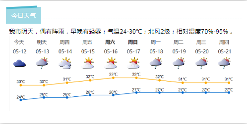 我市陰天間多云,有分散陣雨;氣溫25-30℃;東風(fēng)2-3級;相對濕度65%-95%。