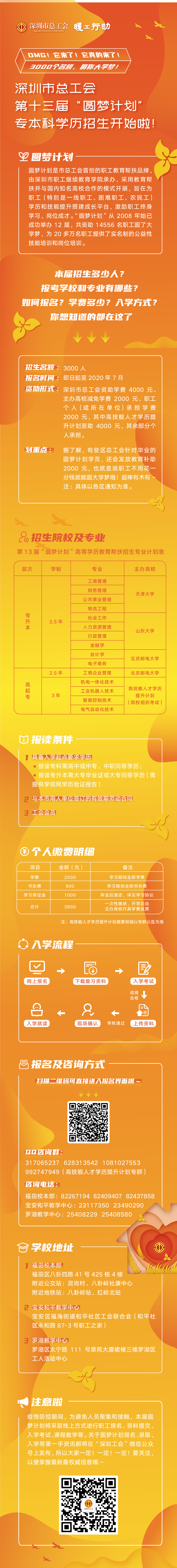 在疫情防控、復(fù)工復(fù)產(chǎn)的特殊形勢(shì)下,結(jié)合市總工會(huì)“暖工行動(dòng)”相關(guān)要求,本屆“圓夢(mèng)計(jì)劃”進(jìn)一步提高幫扶精準(zhǔn)性,向受疫情影響嚴(yán)重的企業(yè)和職工傾斜,推動(dòng)企業(yè)和職工共擔(dān)責(zé)任、共克時(shí)艱,穩(wěn)定職工隊(duì)伍和就業(yè),努力做到職工多轉(zhuǎn)崗、少下崗、多就業(yè)、少失業(yè)。符合報(bào)名條件的職工可在“深圳工會(huì)”微信公眾號(hào)上進(jìn)行報(bào)名,報(bào)名截止日期為7月30日,主辦方將根據(jù)報(bào)名人數(shù)分期分批組織入學(xué)考試。入學(xué)考試采用“文化素養(yǎng)+職業(yè)技能+工作實(shí)績(jī)”的多元評(píng)價(jià)方式,在“文化素養(yǎng)”為主體考試中增加工會(huì)基本知識(shí),提高職工工會(huì)意識(shí)。所有錄取學(xué)員將于今年9月入學(xué)就讀,進(jìn)行線上線下相結(jié)合的學(xué)習(xí),在規(guī)定學(xué)制內(nèi)修滿學(xué)分將獲得各高校頒發(fā)、國(guó)家承認(rèn)的畢業(yè)證書。