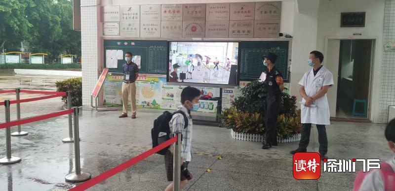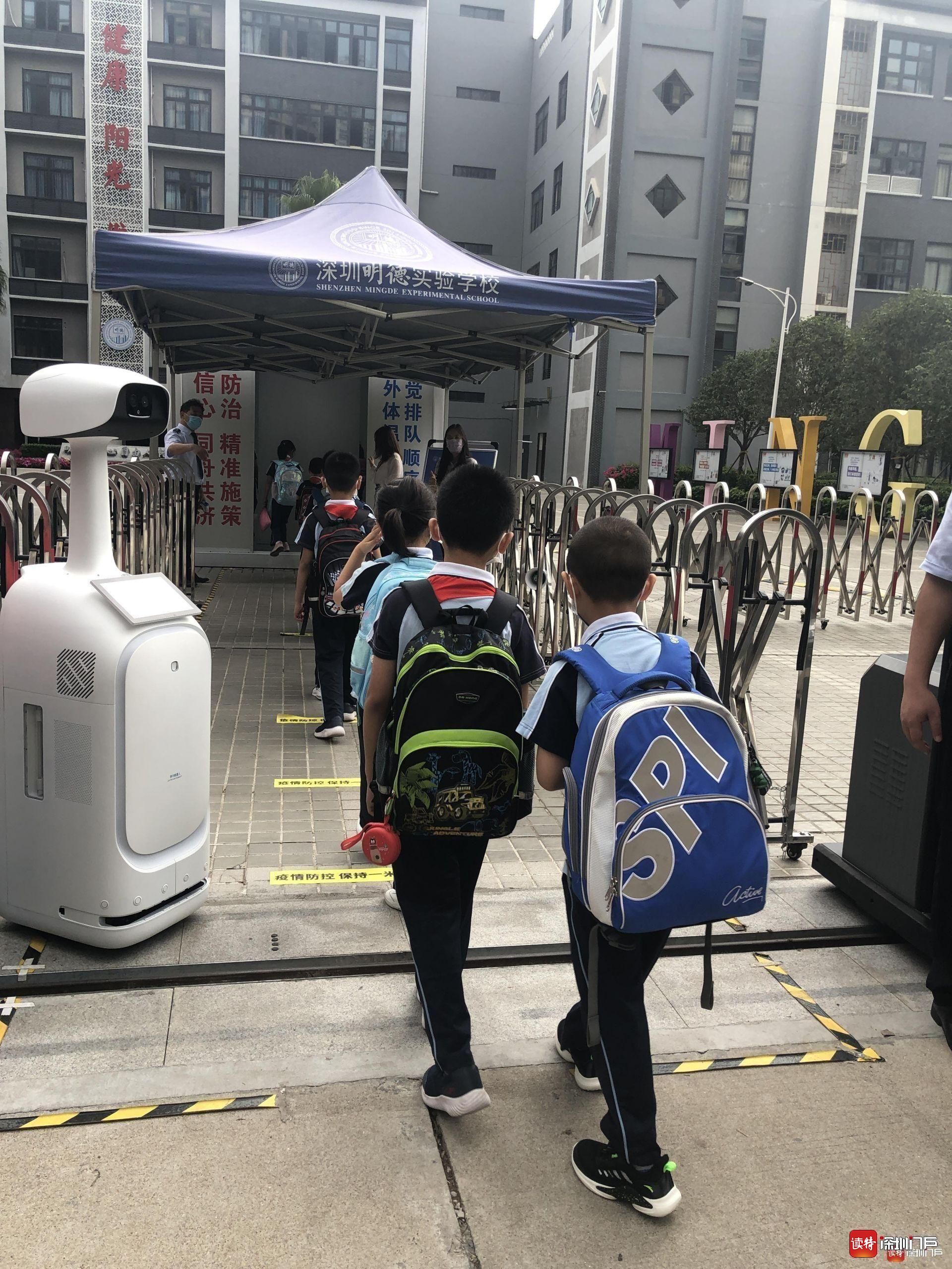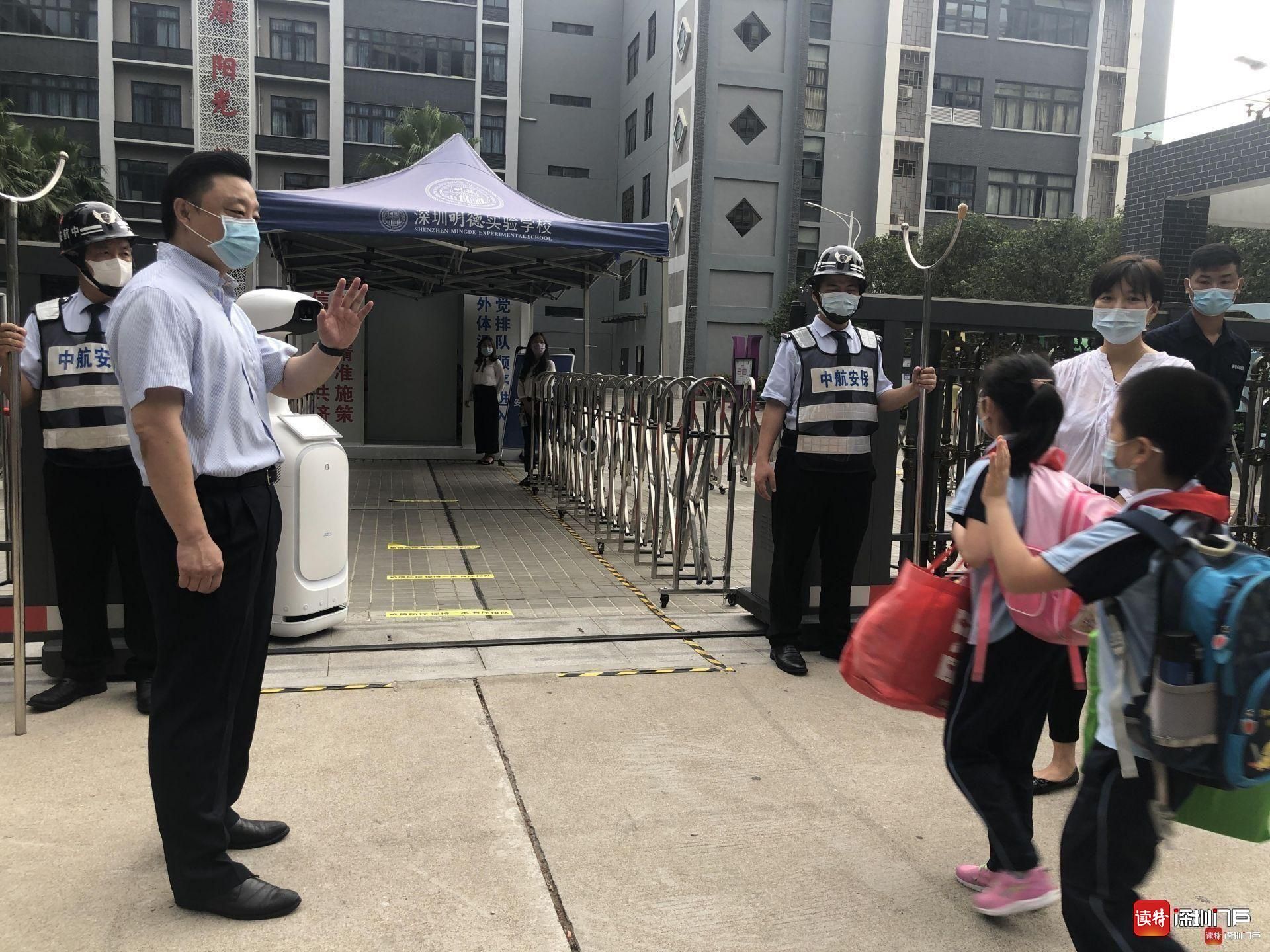 “同學(xué)們好!”“歡迎回來!”從7點起,明德實驗學(xué)校校長魯江與工作人員就在香蜜校區(qū)校門口迎候?qū)W生們,提醒孩子們戴好口罩,也與家長們交流返校事宜。校門口的一臺超氧水消殺機器人也在積極投入工作,工作人員在后臺控制面板可以監(jiān)測到入校人員的體溫情況。