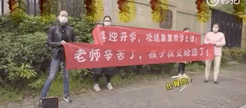 喜上眉梢的家長們甚至站在校門口拉起橫幅:喜迎開學(xué),歡送上課!