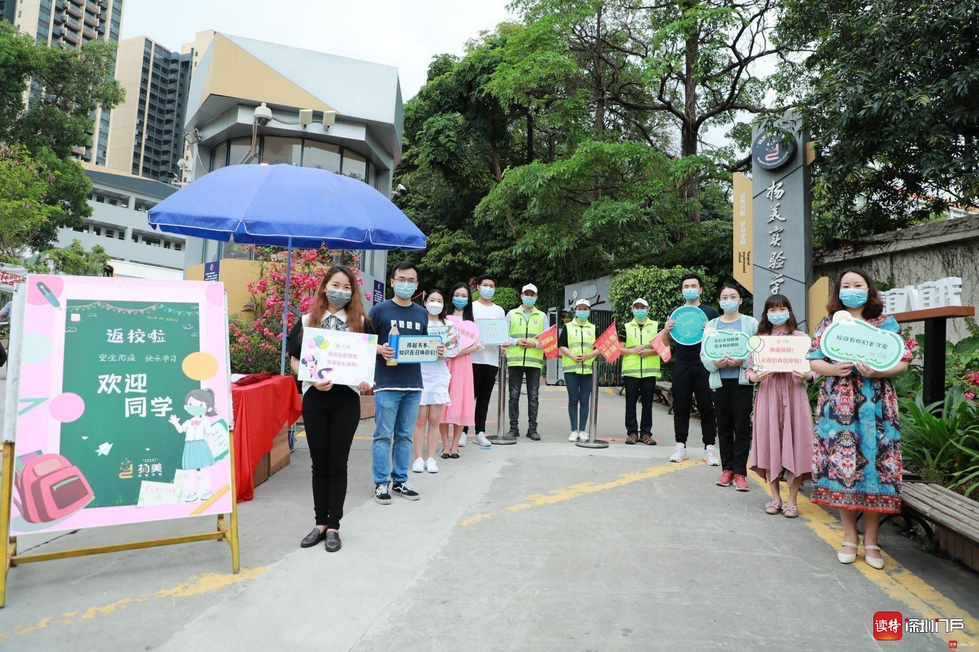揚美實驗的老師們捧著特制歡迎牌,向返校的孩子們問好。家長義工們身穿綠馬甲、手持小紅旗,在校門附近疏通交通,為孩子們保駕護航。揚美學(xué)子佩戴口罩,按照錯峰時間表通過體溫測量儀,有序進入校園。