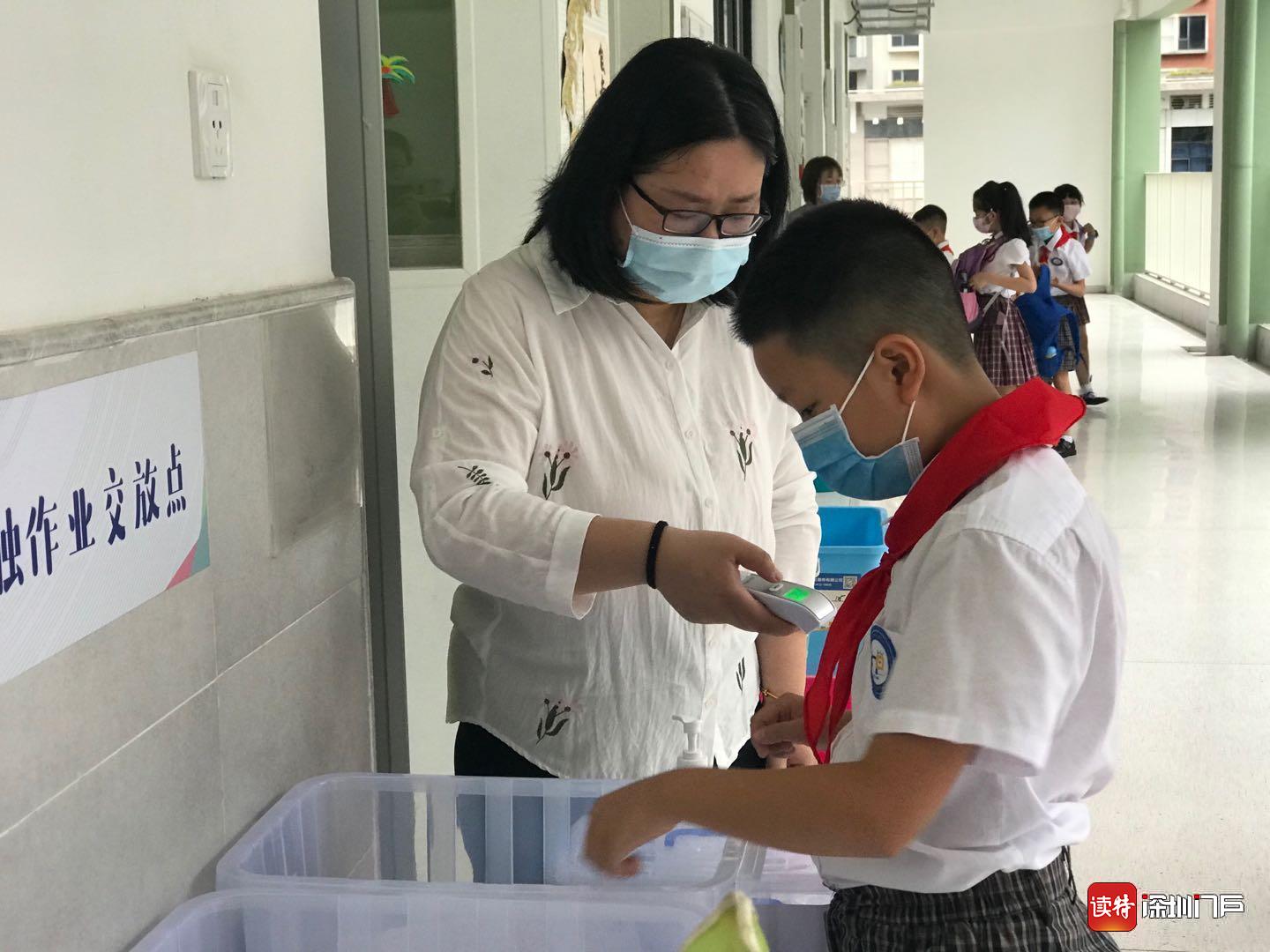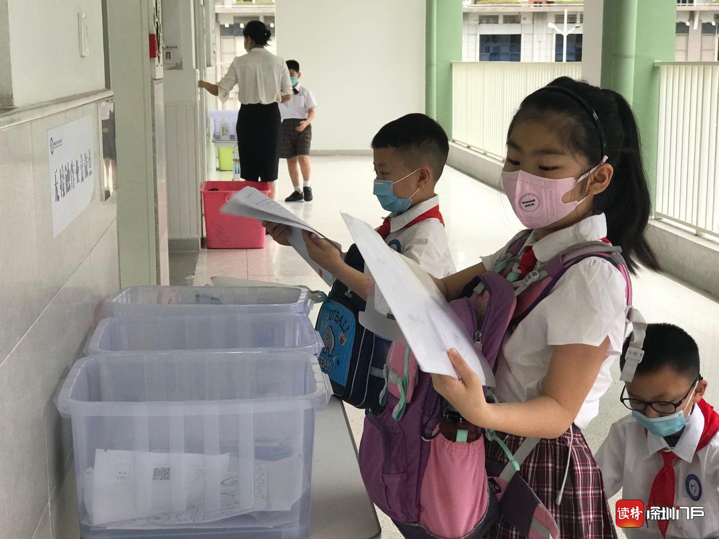 “同學(xué)們早上好!”“老師們好!”18日一大早,龍華區(qū)和平實驗小學(xué)的老師們都早早做好準(zhǔn)備,站在學(xué)校門口,迎接孩子們歸來。在各班教室門口,學(xué)校還貼心的準(zhǔn)備了“無接觸作業(yè)交站點”,同學(xué)們按順序自覺將學(xué)科作業(yè)放進箱內(nèi),減少了不必要的接觸。(讀特記者何亞南)