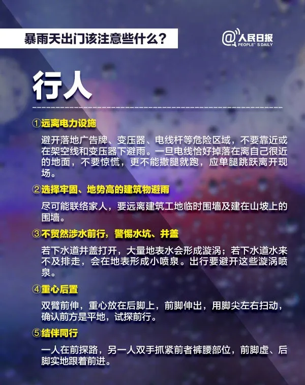 √雨天路滑,注意車輛行駛安全,控制車速防止追尾等事故的發(fā)生,繞開積水隧道涵洞和城市低洼區(qū)域,防止跌入窨井、地坑,不要在深水區(qū)逗留。