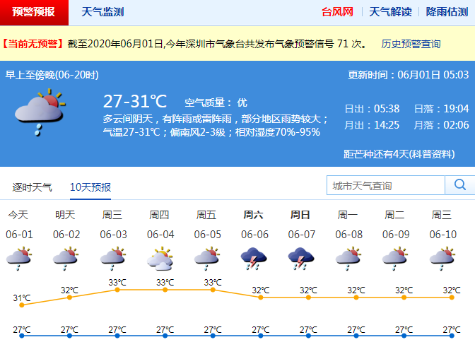 深圳市氣象臺(tái)預(yù)報(bào),未來一周我市天氣仍不穩(wěn)定,雷雨多發(fā)。6月1日至5日,多云有陣雨或雷陣雨,局地雨勢(shì)較大,天氣漸趨悶熱。目前我市處于龍舟水降水多發(fā)季節(jié),需特別關(guān)注降雨給交通帶來的影響。請(qǐng)市民及時(shí)關(guān)注市氣象臺(tái)發(fā)布的最新氣象監(jiān)測(cè)預(yù)報(bào)和預(yù)警信息。