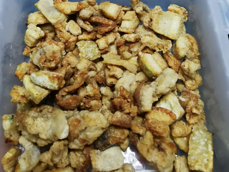 ▲爸爸媽媽童年最愛(ài)的零食是豬油渣,越嚼越香。