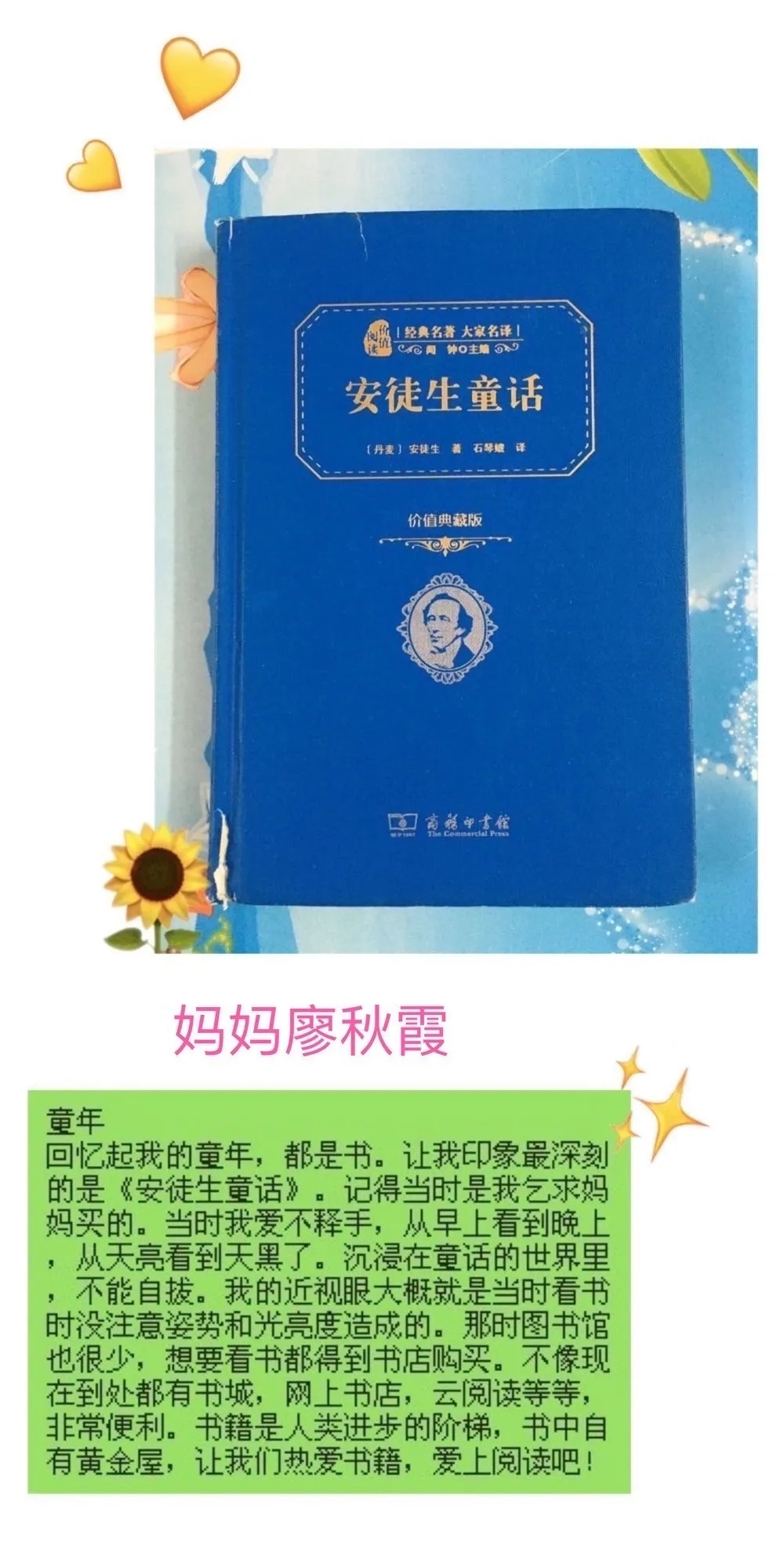 在這快樂(lè)的節(jié)日里,我也讓媽媽和我分享了她記憶中的六·一,她好好思考了一會(huì)兒說(shuō):"還是非常巧的,記憶最深的六·一,也是和你同歲的那一年,那是我在重慶老家過(guò)的最后一個(gè)六·一。記得當(dāng)日穿上了最漂亮的衣服,戴上了紅領(lǐng)巾,早早就去了學(xué)校,在簡(jiǎn)單的慶?;顒?dòng)后,就由老師帶領(lǐng)成績(jī)優(yōu)秀的同學(xué)到公社的禮堂去看慶祝表演活動(dòng),從學(xué)校走到公社要一個(gè)多小時(shí),大家一邊走一邊唱《快樂(lè)的節(jié)日》,非常的歡樂(lè),感覺(jué)自己好似真的變成小鳥(niǎo)了,在會(huì)場(chǎng)里每位同學(xué)都收到了一個(gè)驚喜的小禮包,三十幾年過(guò)去現(xiàn)在回想起來(lái)快樂(lè)的感覺(jué)仍很深刻!好似六·一的感覺(jué)就停頓在那個(gè)時(shí)候,后來(lái)在深圳過(guò)的六·一印象反而都模糊了?!?/p>