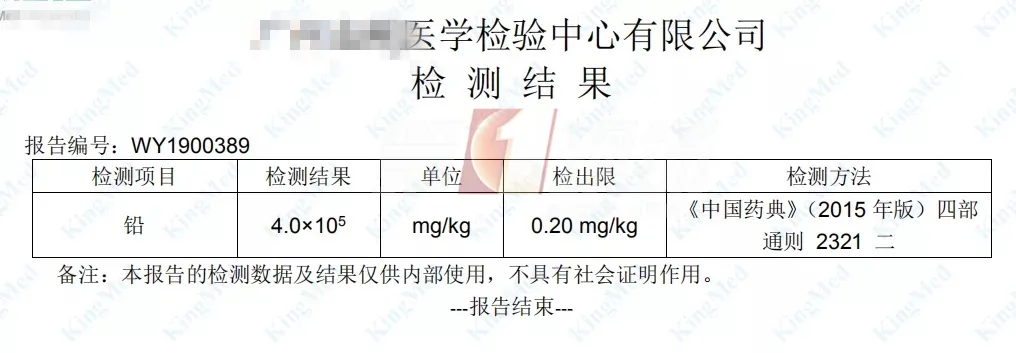 聽了醫(yī)生的建議,孩子家長將瓶子里的粉末拿到第三方檢測公司檢測。結(jié)果顯示,1克的藥粉里面,就含有大概0.4克的鉛!
