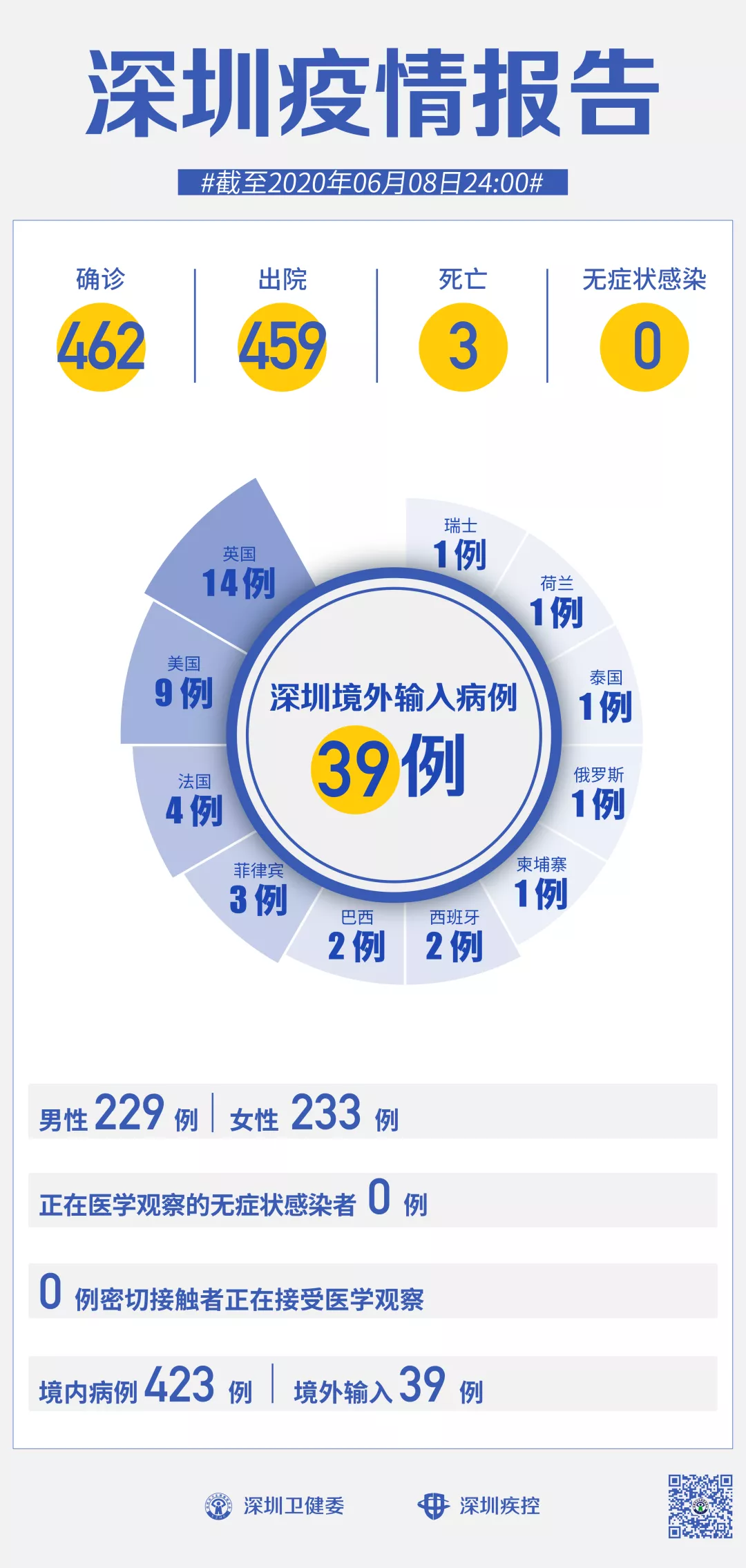 截至6月8日24時,深圳累計報告新冠肺炎病例462例。