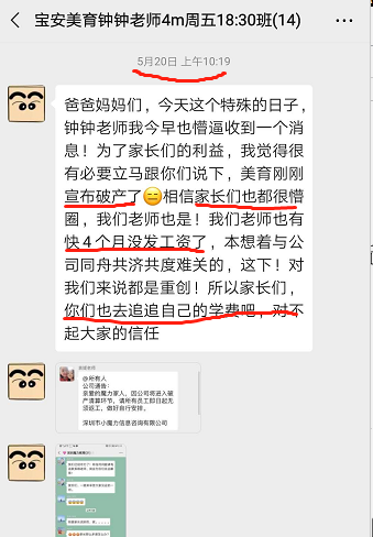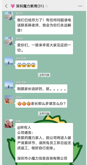 一名丁姓家長介紹,5月20日,家長接到美育老師消息,稱公司剛剛宣布破產(chǎn),老師工資被拖欠4個月。家長介紹,老師曝光該消息后,培訓機構支付了他們的拖欠工資。隨后大量老師離職。