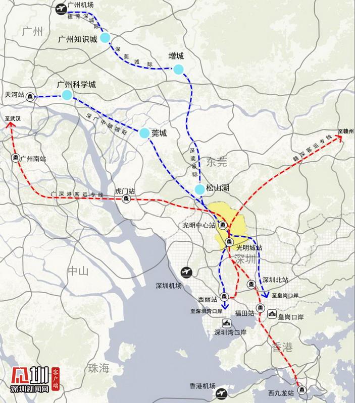 完善產(chǎn)學研結(jié)合的共享服務。光明科學城將建設產(chǎn)業(yè)服務中心和產(chǎn)業(yè)創(chuàng)新轉(zhuǎn)化服務平臺,鼓勵企業(yè)開放圍墻,增加沿街界面,鼓勵土地混合利用,提升產(chǎn)城融合水平,增加城市活力,促進產(chǎn)業(yè)創(chuàng)新。在交通網(wǎng)絡方面,光明科學城依托中深惠城際、深莞城際和城市軌道,加強與深圳寶安國際機場、廣州白云國際機場的快速聯(lián)系;依托廣深港客專、深莞城際、深廣中軸城際和城市軌道,加強與香港西九龍口岸、深圳灣口岸、皇崗口岸、福田口岸等的便捷聯(lián)系;加快深廣中軸城際、深莞城際軌道規(guī)劃建設,推動深莞城際與深廣中軸城際、中深惠城際、中虎龍城際和莞惠城際的“互聯(lián)互通”。