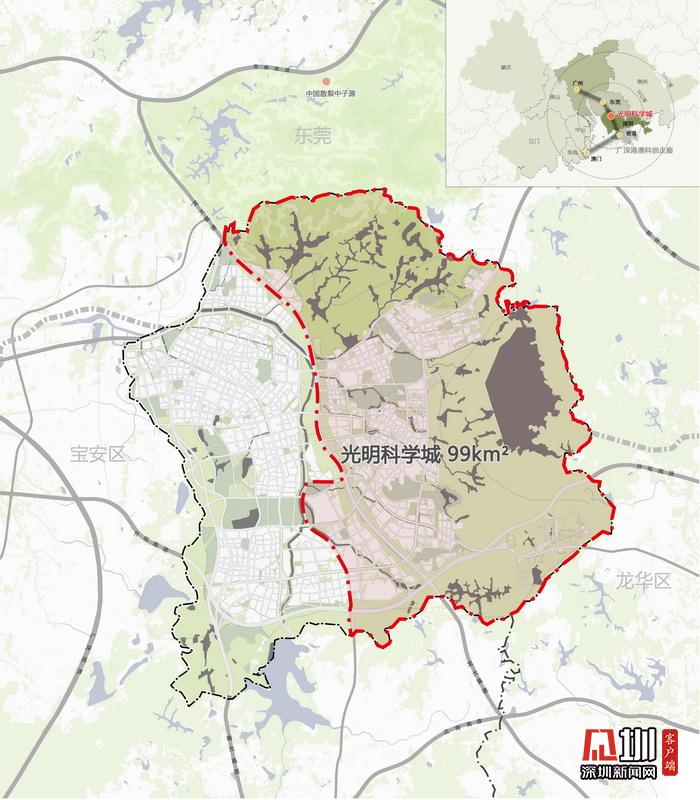 光明科學城區(qū)位與規(guī)劃范圍示意圖。