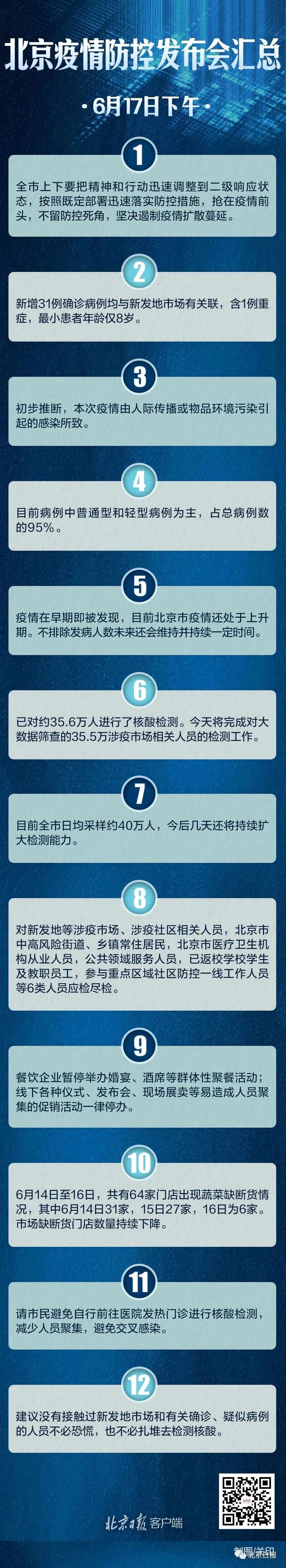 北京新冠肺炎疫情防控工作領(lǐng)導小組檢疫檢測工作組副組長、市委組織部副部長張強介紹,6月13日起,已迅速對新發(fā)地等出現(xiàn)疫情的市場人員、周邊小區(qū)居民、大數(shù)據(jù)排查涉疫市場人員,社區(qū)敲門行動中主動報告、有關(guān)接觸史的人員以及全市各農(nóng)貿(mào)市場工作人員約35.6萬人進行了核酸檢測。6月17日將完成對大數(shù)據(jù)篩查的涉疫市場相關(guān)人員的檢測工作,對重點行業(yè)、重點領(lǐng)域、重點地區(qū)人員的核酸檢測工作也在同步進行。