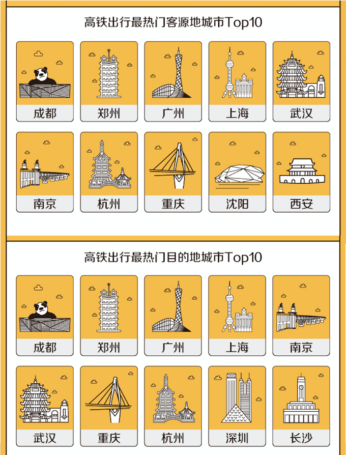 除此之外,城市周邊高鐵短途游受歡迎,特別是2小時內(nèi)的高鐵行程受到家庭出游的青睞。比如,上海開往杭州、蘇州、南京;廣州開往深圳、東莞、珠海;成都開往重慶、綿陽、眉山;武漢開往孝感、襄陽、黃石等城市短途高鐵線路預(yù)定量排名靠前。