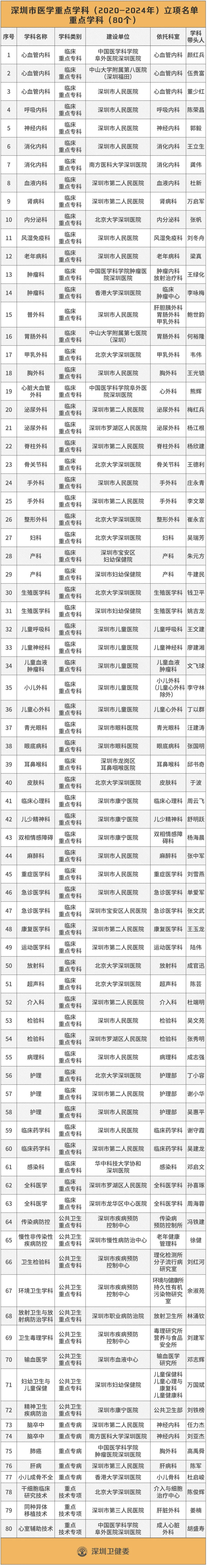 6月19日,深圳市衛(wèi)健委公布了2020-2024年的深圳市醫(yī)學(xué)重點(diǎn)學(xué)科立項(xiàng)名單,包括80個(gè)重點(diǎn)學(xué)科、15個(gè)重點(diǎn)培育學(xué)科。此外,深圳還有24個(gè)專科入選“省重點(diǎn)”名單,其中13個(gè)是國家衛(wèi)健委或國家中醫(yī)藥管理局認(rèn)定的國家級(jí)臨床重點(diǎn)???。這份名單是2019年由廣東省衛(wèi)健委公布的“廣東省高水平臨床重點(diǎn)??啤泵麊?。