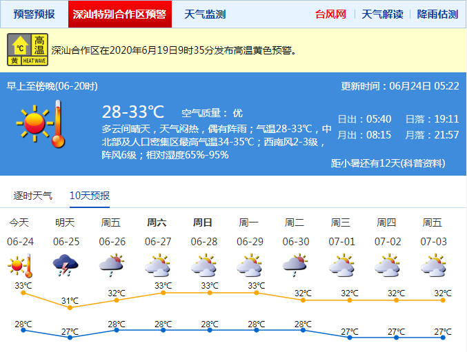 見圳客戶端?深圳新聞網(wǎng)2020年6月24日訊 據(jù)深圳市氣象局最新消息,深圳6月24日多云間晴天,天氣悶熱,偶有陣雨;氣溫28-33℃,中北部及人口密集區(qū)最高氣溫34-35℃;西南風(fēng)2-3級,陣風(fēng)6級;相對濕度65%-95%。