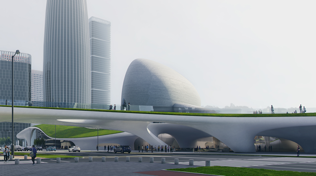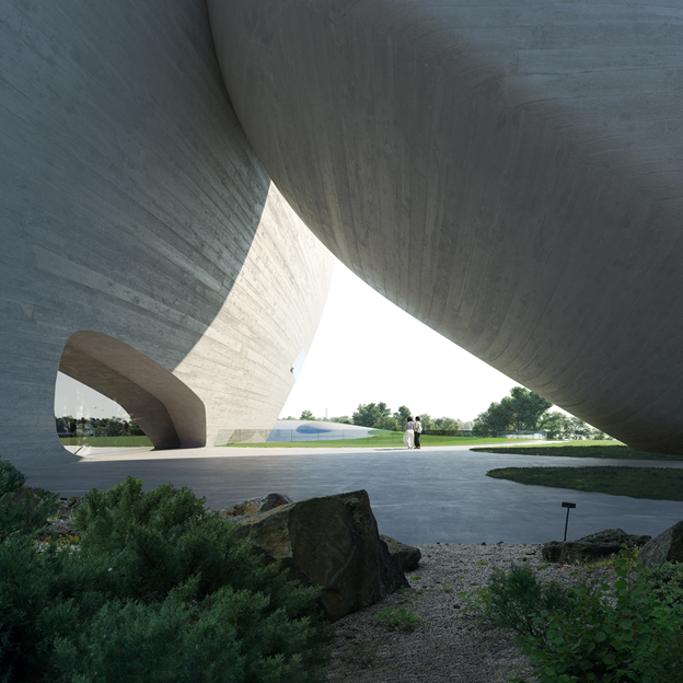 MAD的方案將較大體量的標(biāo)準(zhǔn)展覽空間、公共教育場地、圖書館、接待大堂、咖啡廳、配套商業(yè)等功能放置在首層并覆土,屋頂形成綠地與城市直接連接,構(gòu)成這個(gè)區(qū)域面積最大的公園。順應(yīng)建筑的曲線,屋頂坡度自然發(fā)展,柔和回落大地,接壤之處設(shè)計(jì)成數(shù)個(gè)下沉庭院,高低相合,延綿不斷。