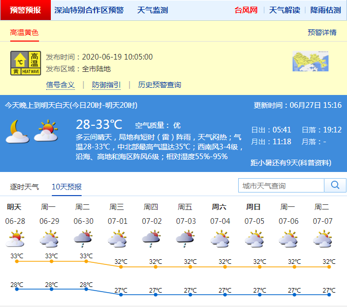 見圳客戶端?深圳新聞網(wǎng)2020年6月27日訊 根據(jù)深圳氣象局最新消息,深圳市27日17-20時(shí),多云間晴天,局地有零星小雨;氣溫29-32℃;西南風(fēng)3-4級(jí),沿海和高地最大陣風(fēng)6級(jí);相對(duì)濕度65%-85%。