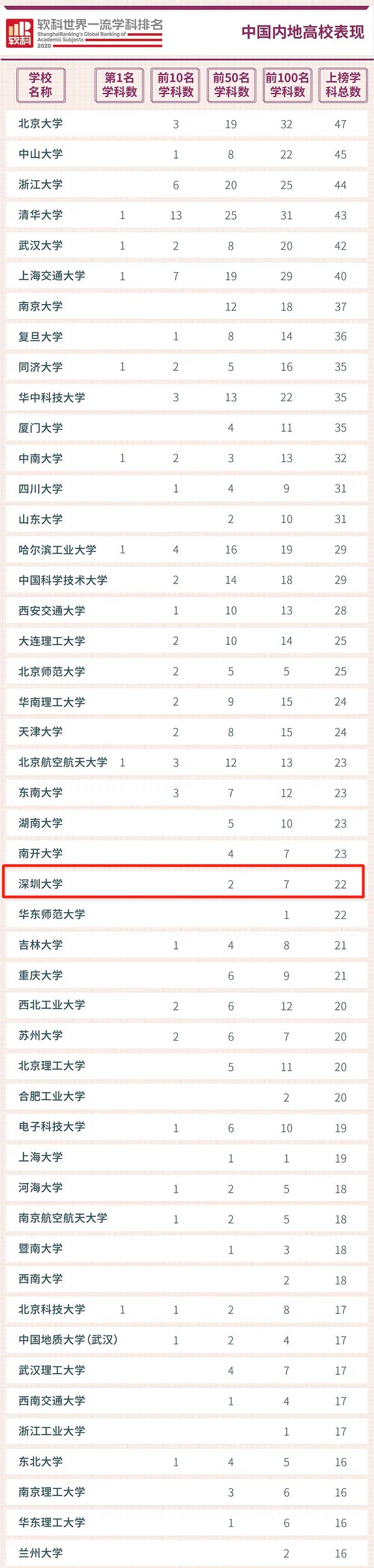 見圳客戶端·深圳新聞網(wǎng)2020年6月29日訊(見圳客戶端、深圳新聞網(wǎng)記者 梁榆其 金洪竹)6月29日,軟科正式發(fā)布2020“軟科世界一流學(xué)科排名”,排名覆蓋54個學(xué)科,涉及理學(xué)、工學(xué)、生命科學(xué)、醫(yī)學(xué)和社會科學(xué)五大領(lǐng)域,中國內(nèi)地共有253所高校上榜。深圳大學(xué)(以下簡稱“深大”)共有22個學(xué)科上榜,上榜學(xué)科數(shù)領(lǐng)跑地方高校,總上榜學(xué)科數(shù)位列中國內(nèi)地高校26位,其中,7個學(xué)科位列世界百強(qiáng),2個學(xué)科進(jìn)入世界50強(qiáng)。